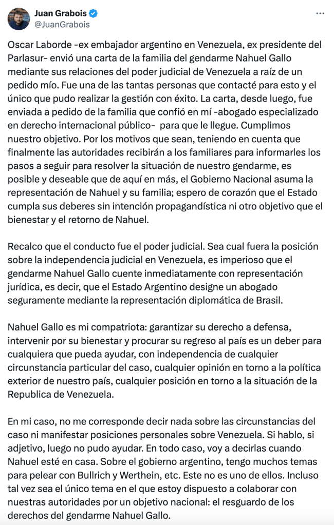 «No me corresponde decir nada sobre las circunstancias del caso ni manifestar posiciones personales sobre Venezuela. Si hablo, si adjetivo, luego no pudo ayudar. En todo caso, voy a decirlas cuando Nahuel esté en casa», dijo.