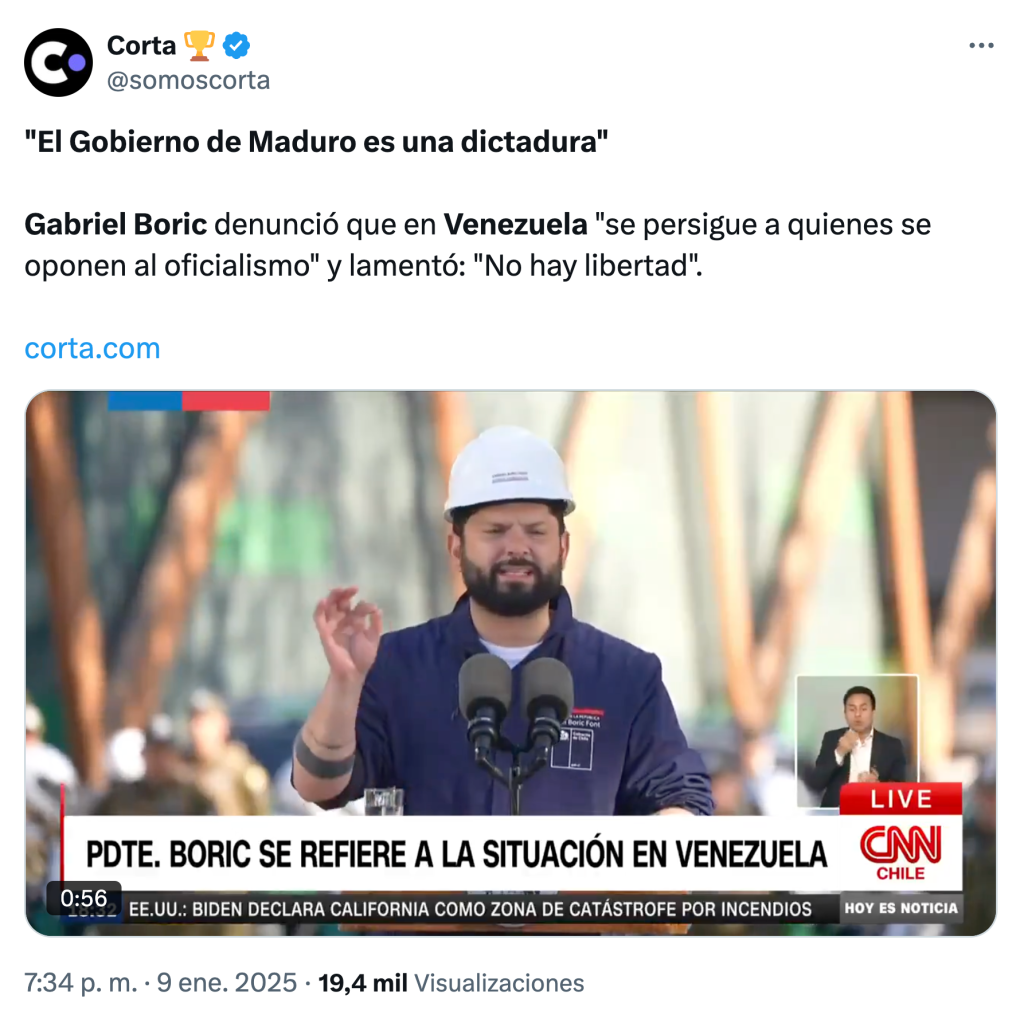 Gabriel Boric, más claro que todos, no dudó en señalar que «el gobierno de Nicolás Maduro se ha convertido en una dictadura que se robó las últimas elecciones».