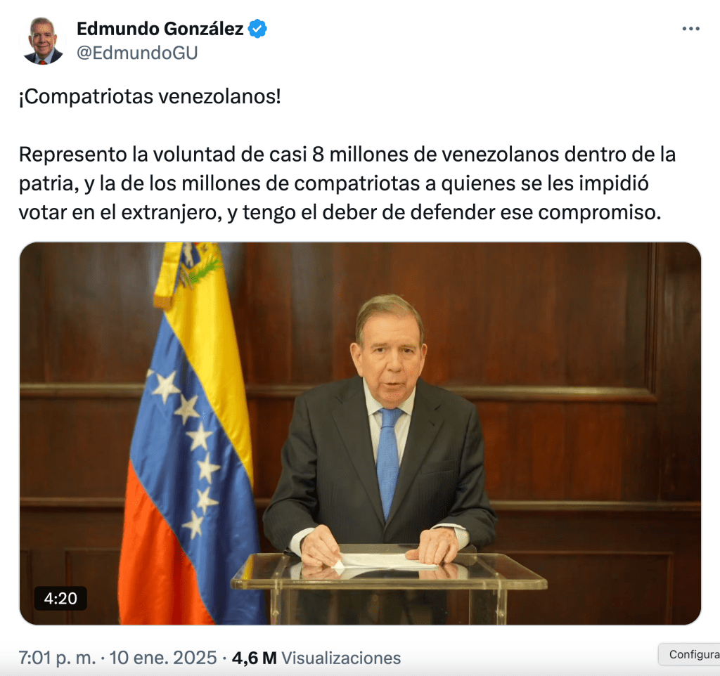 Edmundo González Urrutia, aparente ganador de las elecciones de julio, no pudo cumplir su promesa de volver a Caracas, donde tiene orden de captura, y se limitó a prometer un pronto retorno y –otra vez– a jugar la carta del llamado a la insubordinación militar contra Maduro, quien gobernará hasta 2031 y cuyo límite parece ser el horizonte infinito.
