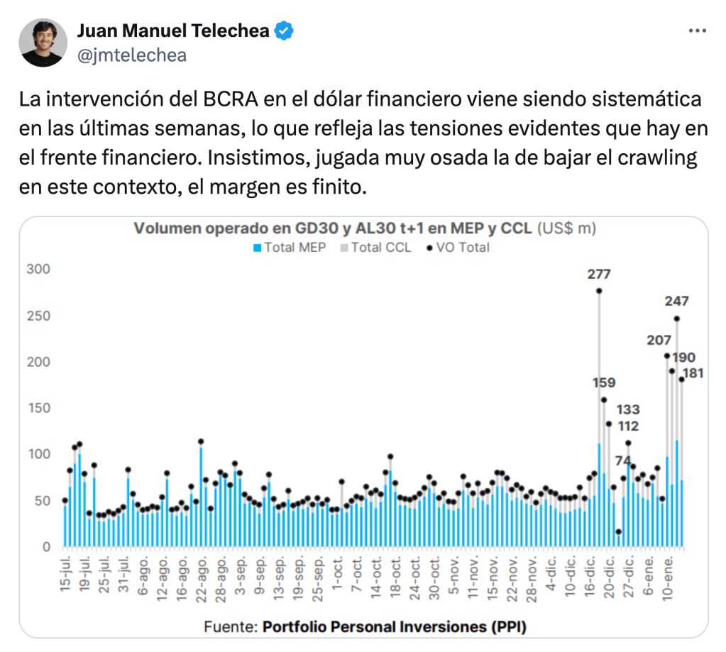 «La reducción de tasas por parte del Central es algo que sucederá en el corto plazo, pero no está claro que ocurra de manera inminente. Sobre todo por la necesidad de manejarse con cautela luego de un mes de fuerte expansión monetaria como diciembre. Siempre se trata de un período de aumento de la demanda de dinero, pero que luego cae a partir de la segunda quincena de febrero», escribió Pablo Wende en Infobae. «Por lo tanto, luce más cauteloso evitar sorpresas y mantener a raya la cantidad de pesos que circulan en vez de acelerar la baja de la tasa de interés, lo que podría ocurrir un poco más adelante«.