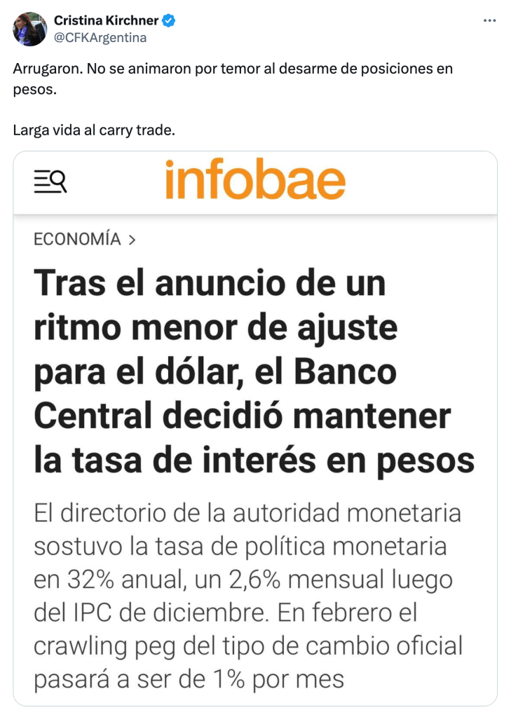 Se puede pensar en unan reedición del carry trade, como denunció Cristina Fernandez de Kirchner con ironía en X o atender las razones del Gobierno. Sin embargo, surge una pregunta incitante: si la resaca monetaria de diciembre imponía frenar en materia de tasas, ¿para qué se apuró el jefe de Estado a anunciar que, a falta de una, le pondría las dos botas encima al tipo de cambio oficial? Sobre todo cuando la inflación del mes pasado fue levemente superior al 2,5% que él mismo había establecido como límite para ralentizar el crawling peg.