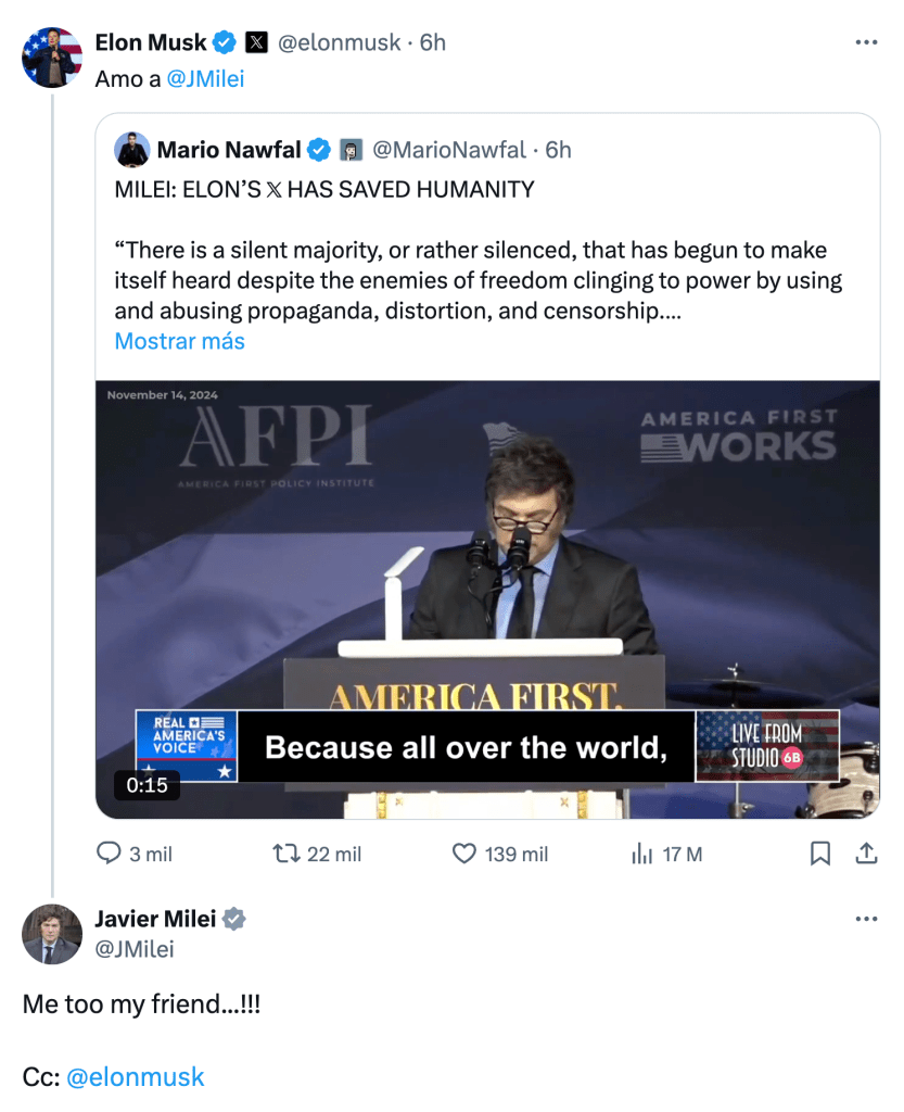 Los arrumacos que Musk y Milei no dejan de dedicarse constituyen un dato político que sería absurdo ignorar en la Argentina. El magnate no solamente reposteó en su red X un fragmento del discurso que el segundo, «Titán de la Reforma Económica» –así lo dijo el Hispanic Inaugural Ball–, sino que añadió un «amo a @JMilei». «Me too my friend!», devolvió el Titán.
