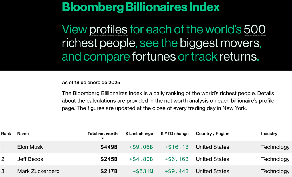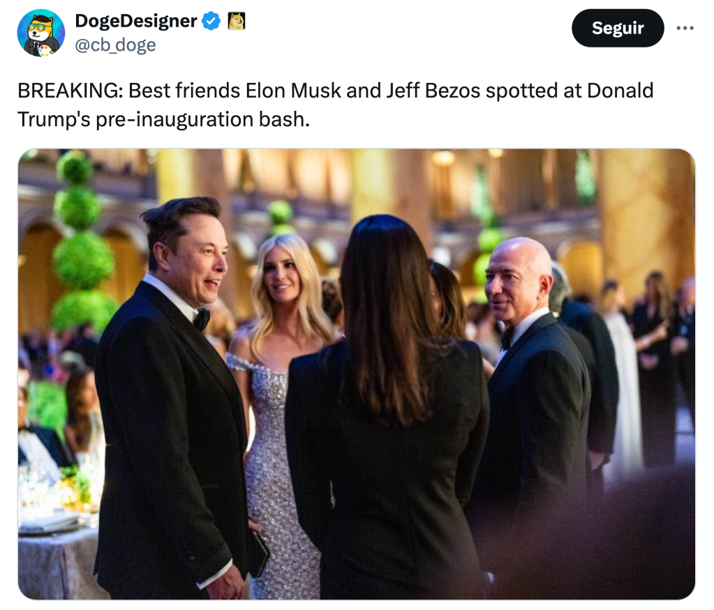 Estos serán, entre otros, el futuro cosecretario –junto a Vivek Ramaswamy– de Eficiencia Gubernamental, hombre más rico de la historia y autoproclamado king maker de la política europea: Elon Musk. Junto a él estarán sus competidores y escoltas en el ranking de los más acaudalados, rendidos ahora a su poder: Jeff Bezos y Mark Zuckerberg.