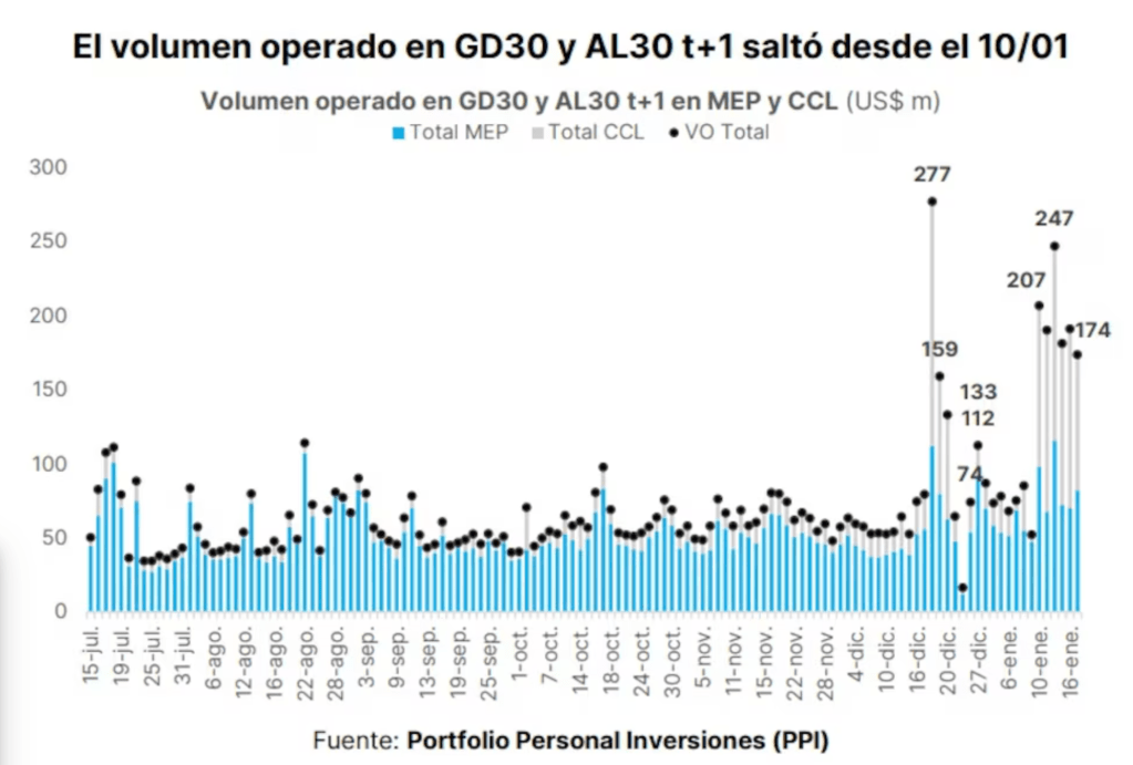El viernes 17, previo a la última rueda de esa semana, el broker Grupo IEB señaló en un informe que, en las últimas ruedas, a juzgar por el volumen operado de (títulos) GD30 y AL30, existió intervención oficial en los dólares financieros, que permitieron que la divisa se mantenga prácticamente flat«, señaló. «Si bien esta estimación puede estar algo distorsionada por la reinversión en los bonos hard-dollar, si medimos los volúmenes de las últimas ruedas contra el promedio previo, podemos estimar que existió una intervención del orden de los 100 millones de dólares diarios«, añadió siempre citando a Grupo IEB.