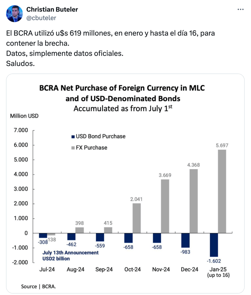 «Solamente en la primera quincena, enero ya se convirtió en el mes de mayor intervención desde el lanzamiento de la segunda etapa del programa de estabilización», señaló Buteler. «El Banco Central utilizó 619 millones de dólares hasta el 16 de enero para contener la brecha», precisó.