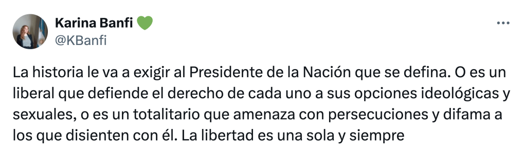 La diputada radical Karina Banfi señaló con candor en las redes sociales que «la historia le va a exigir al Presidente de la Nación que se defina. O es un liberal que defiende el derecho de cada uno a sus opciones ideológicas y sexuales, o es un totalitario que amenaza con persecuciones y difama a los que disienten con él». Ella, destratada cada día como militante feminista, todavía cree que hay espacio para la duda.