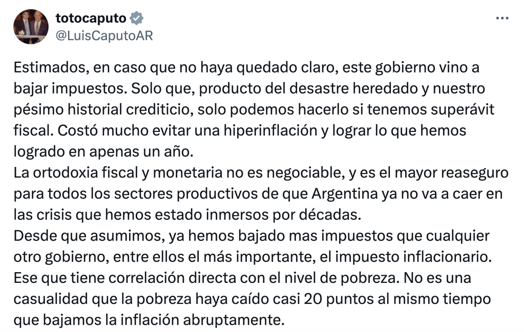 Urgido por los motivos confesables, que ya anunciaban planteos de los gobernadores de la zona central y hasta protestas en los campos –donde hay mucho voto propio–, y por los otros, Caputo borró con el codo lo que poco antes había tuiteado con la mano. El martes, hay que recordar, había rechazado un planteo de Martín Llaryora, Maximiliano Pullaro y Rogelio Frigerio al afirmar que el Gobierno no baja los impuestos porque no puede y no porque no quiere.