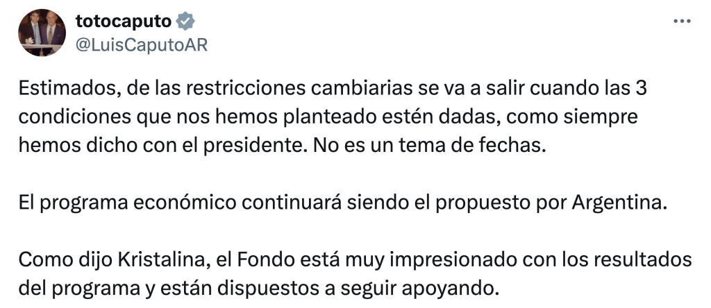El tipo de cambio oficial –cada vez más ralentizado– no es un problema mientras exista el cepo, tema en el que Caputo contradijo el apuro de Milei y estiró el plazo de las expectativas sobre su desarme, que podrían ir más allá del anuncio de un acuerdo con el Fondo Monetario Internacional (FMI).