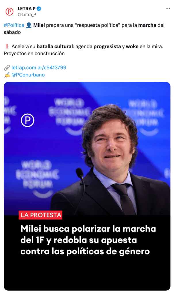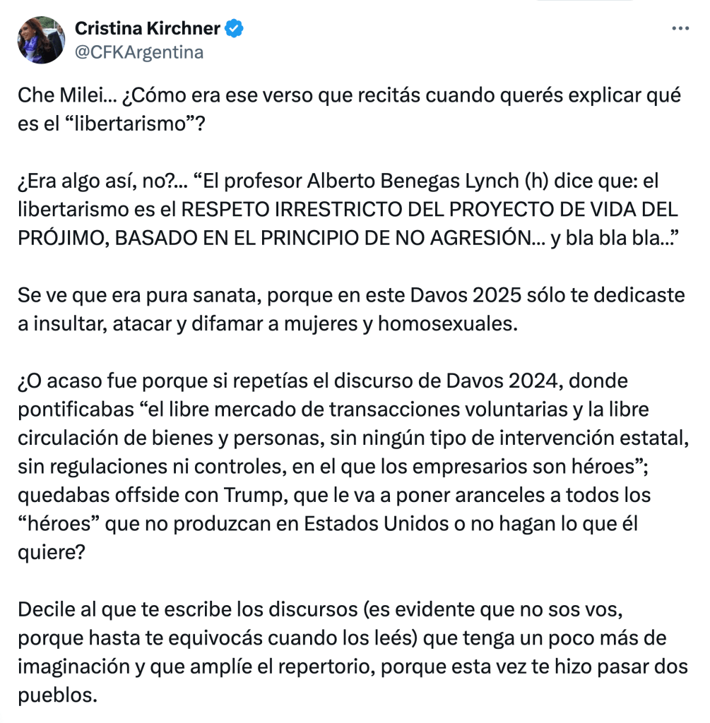 En tono canyengue, su posteo hizo meandros alrededor de la economía, el FMI, las divisiones que atiza el ultraderechista y sus relaciones peligrosas con referentes del exterior, pero no terminó de dar en el clavo. Lo que a esta altura se le reprocha a Milei no son sus formas ni su falta de lógica, sino el hecho de que comienza a desplegar un proyecto político de corte autoritario, al que urge aplicarle los límites del sistema.
