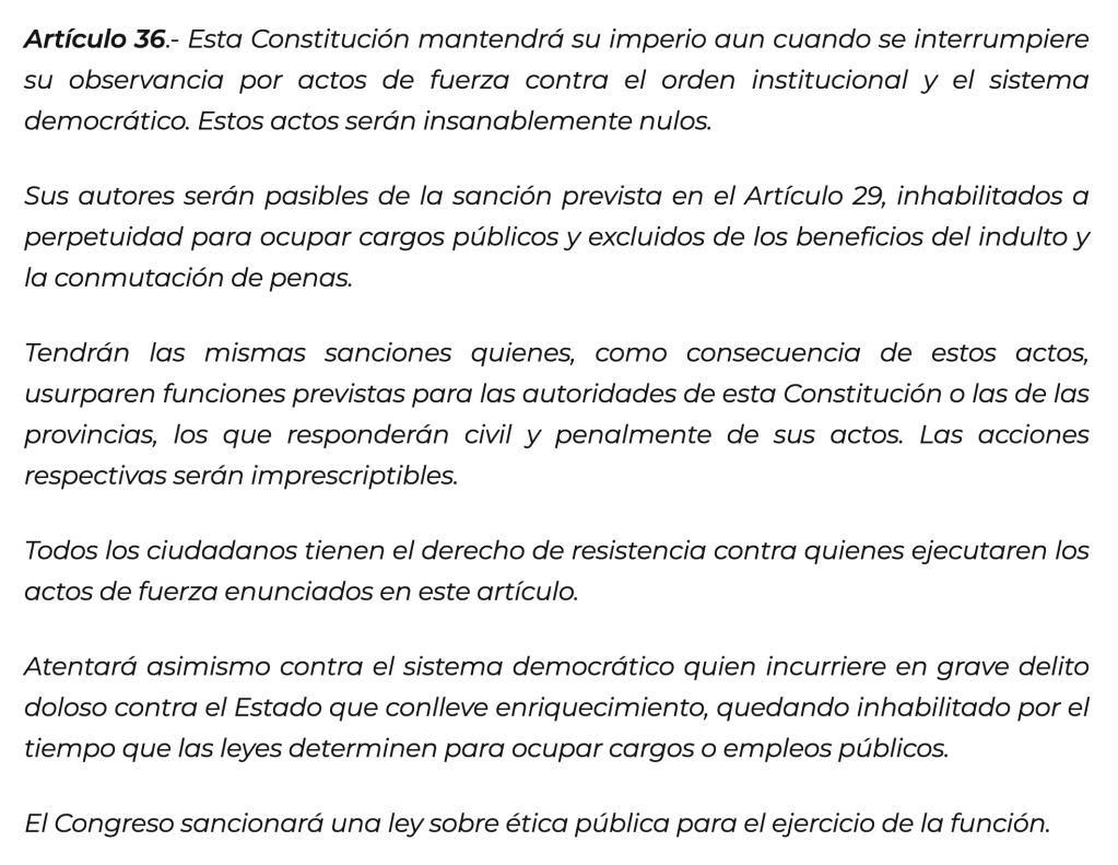 La jefa de la Coalición Cívica indicó que los hechos y dichos que «contravienen la Constitución Nacional y las leyes» se vuelven «de hecho (de facto) contrarios a lo dispuesto en el artículo 36º de la Constitución Nacional«. «Todo discurso o acto dirigidos expresamente a violar la Constitución Nacional lo convierte en un gobierno de hecho en los términos del artículo constitucional mencionado, por ser contrario al Estado de Derecho«.