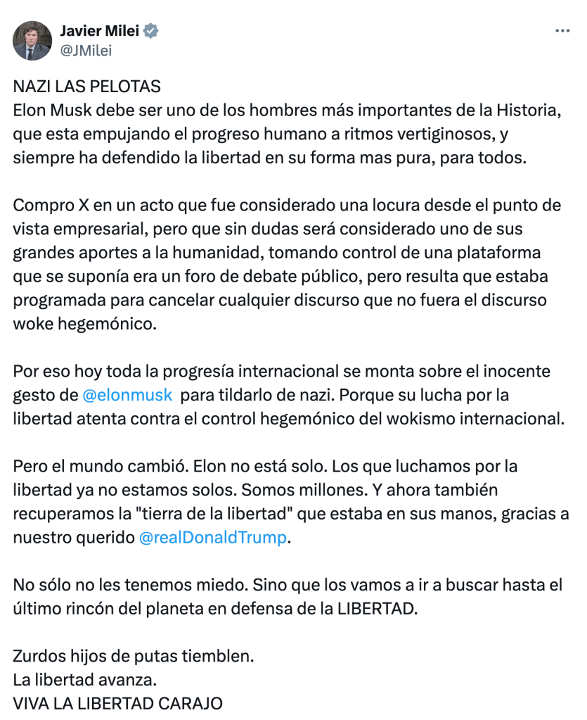 La gente a la que gobierna, y por cuyo bienestar debería velar, incluye a una minoría que comparte su visión de la vida, pero también, para señalar los términos de la ultraderecha vernácula y los suyos propios, a «zurdos hijos de putas», «kukas», «libertarados», «tibios», «feminazis» y «putos».