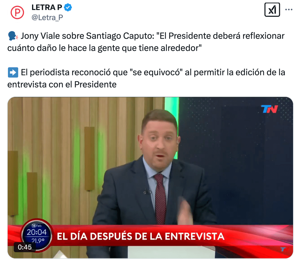 «Equivocado, a mi parecer y al del Presidente, Santiago Caputo corta la entrevista, donde no había nada malo», salió a declarar el karinista Manuel Adorni. «Tiene el defecto de la excelencia. Notó que eso (la alusión a Cúneo) podía prestar a confusión de alguna parte de la audiencia y decidió cortar la nota. De hecho, terminó la nota y el Presidente le dijo ‘Santiago, esto es innecesario’. Santiago habitualmente no está en las notas, no sabe que la dinámica es no cortarlas por ningún aspecto», añadió.