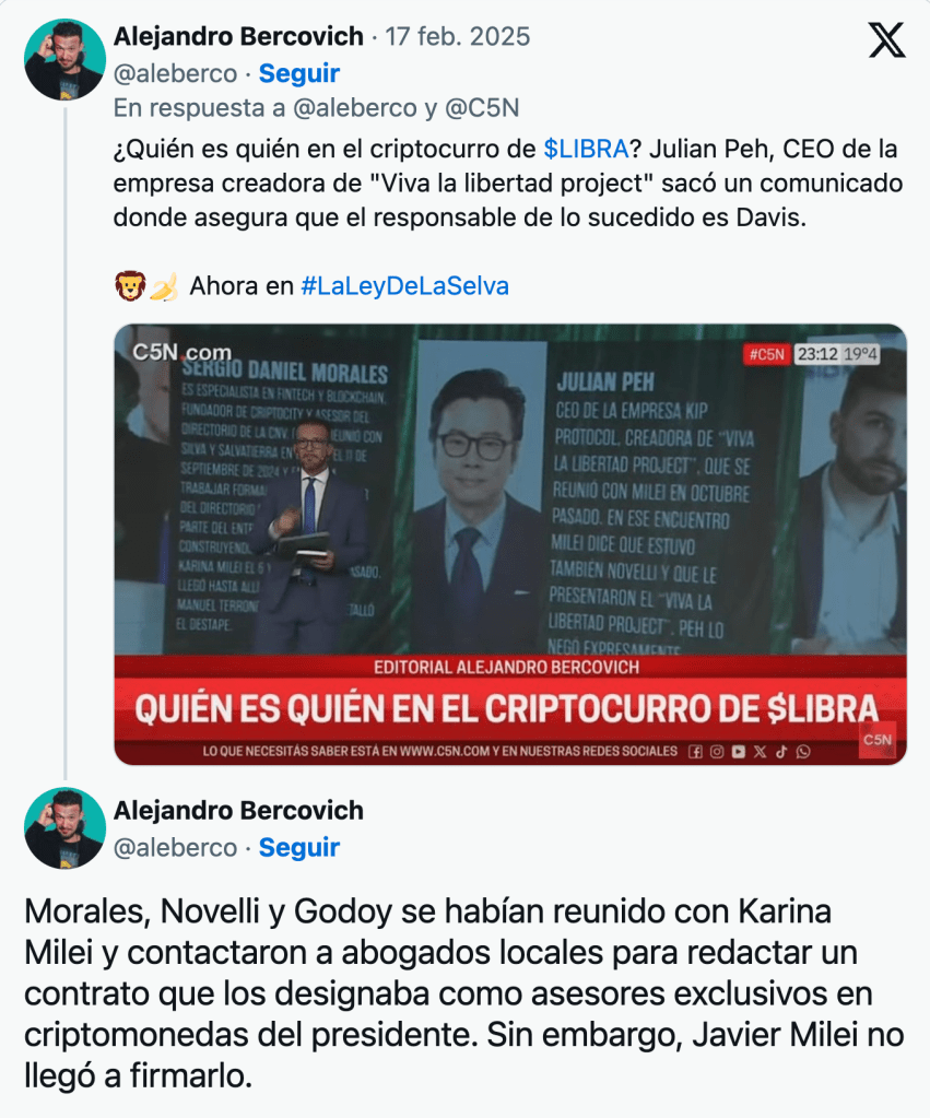 El periodista Alejandro Bercovich afirmó que «Morales, Novelli y Godoy se habían reunido con Karina Milei y contactaron a abogados locales para redactar un contrato que los designaba como asesores exclusivos en criptomonedas del Presidente. Sin embargo, Javier Milei no llegó a firmarlo». «Diógenes Casares, hijo de Wenceslao (Casares) e importante empresario del sector, asegura que alguien del entorno de Milei cobró 5 millones de dólares para que el Presidente hiciera la promoción» de $LIBRA, añadió.