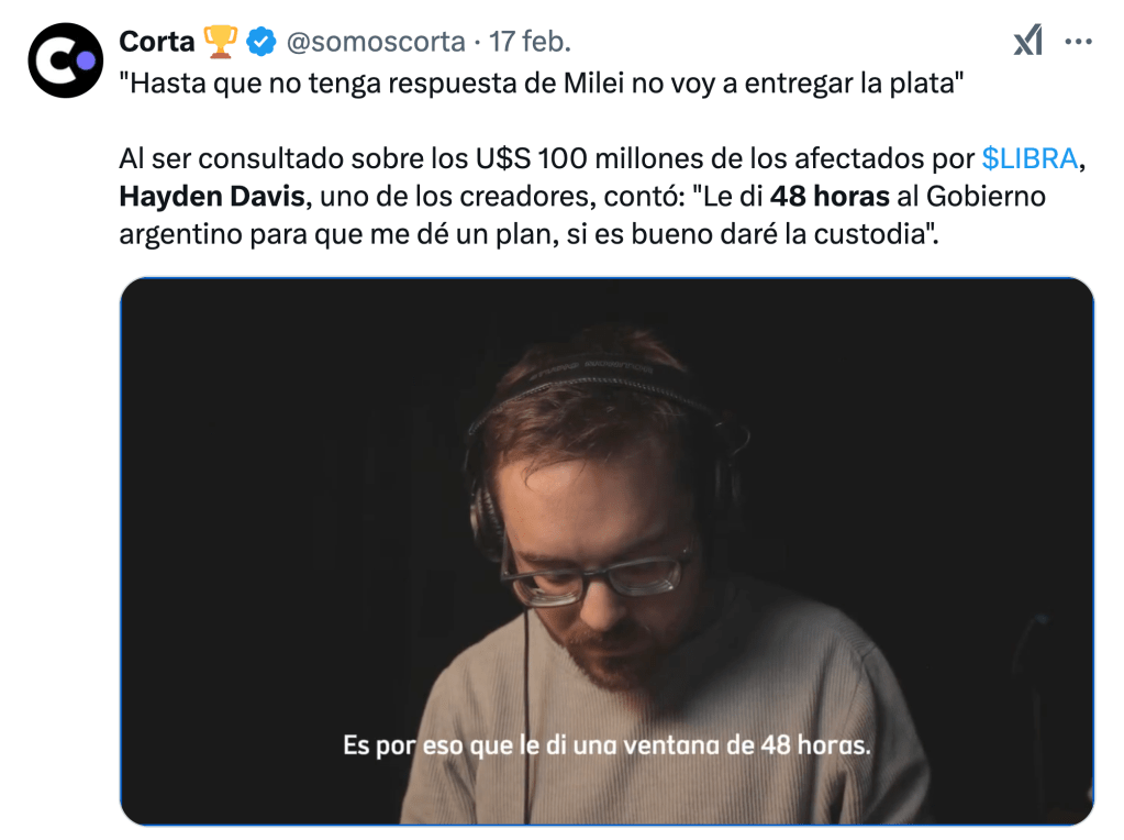 En su carácter de custodio del proyecto, Davis había acusado a su «asesorado» Milei de haber provocado el descalabro de $LIBRA con el retiro de su aval y le había dado 48 horas para darles una solución a los damnificados. ¿Se cumplió el plazo?