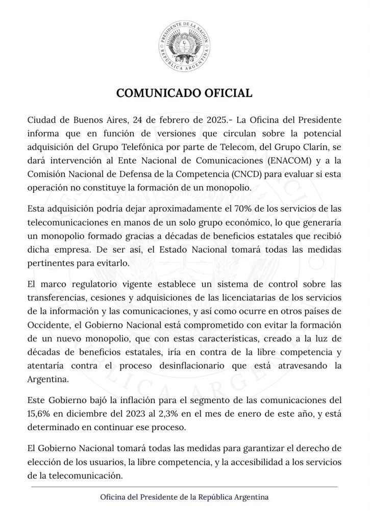 Telecom –que es Clarín– dijo que «con esta operación demuestra su vocación de seguir invirtiendo en la Argentina en el marco de las condiciones macroeconómicas actuales que suman certeza y estabilidad a la inversión privada y competitiva». Caricias significativas para Milei.