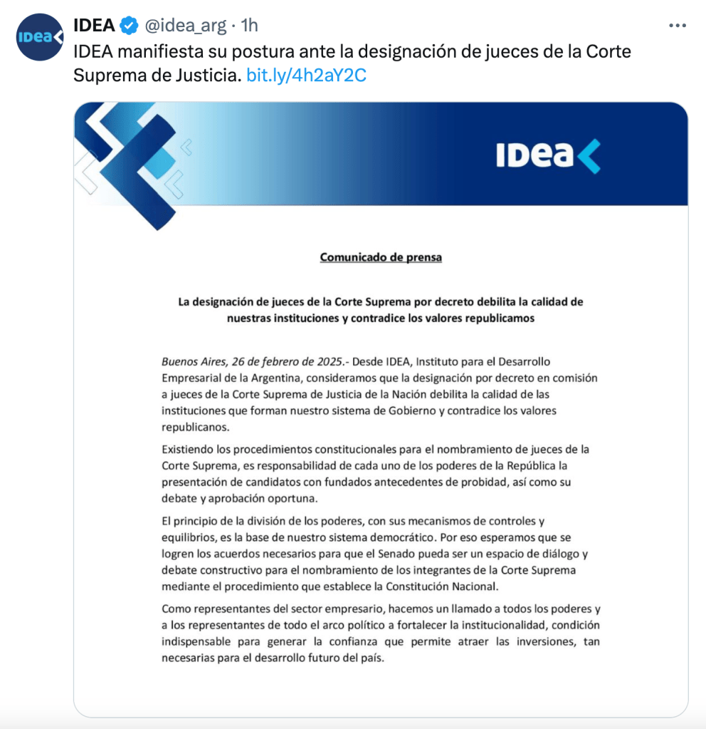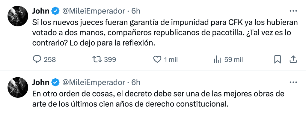 Mientras, legisladores, fiscales y jueces duermen la siesta ante la irregularidad de que uno de los hombres más poderosos del país sea un simple asesor sin firma. La cuenta de Twitter que se suele atribuir a La Sombra, Santiago Caputo, describió el decretazo supremo como «una obra de arte».