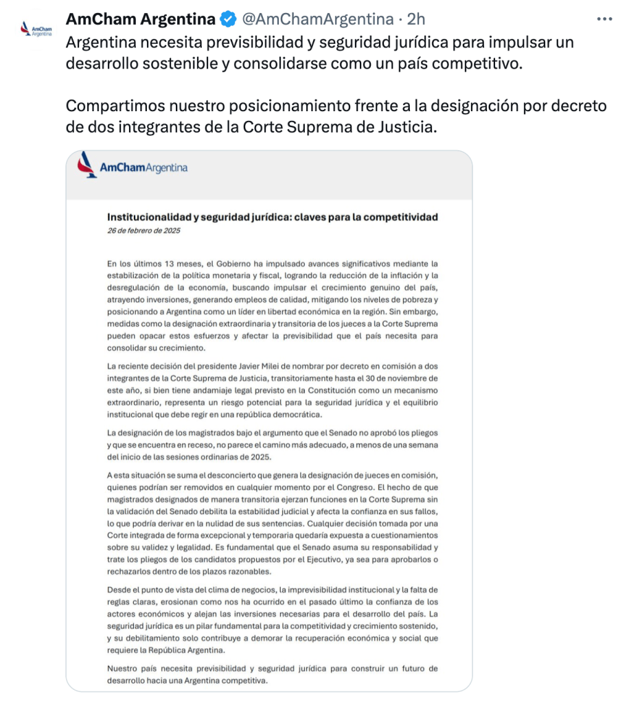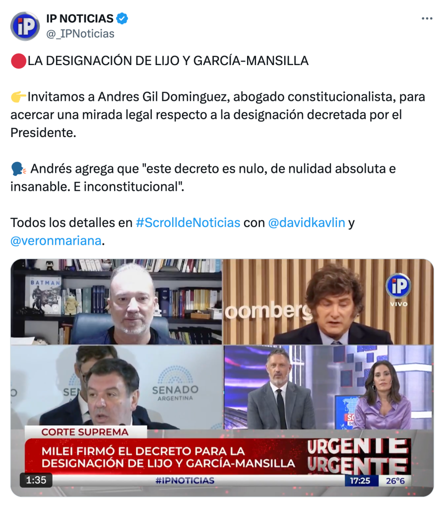 En la misma línea, Andrés Gil Domínguez dijo que «el decreto 137/2025 (…) es nulo de nulidad constitucional absoluta e insanable y, además, inconstitucional por cuanto no se verifican las circunstancias excepcionales que la Constitución exige para el nombramiento de jueces en comisión».
