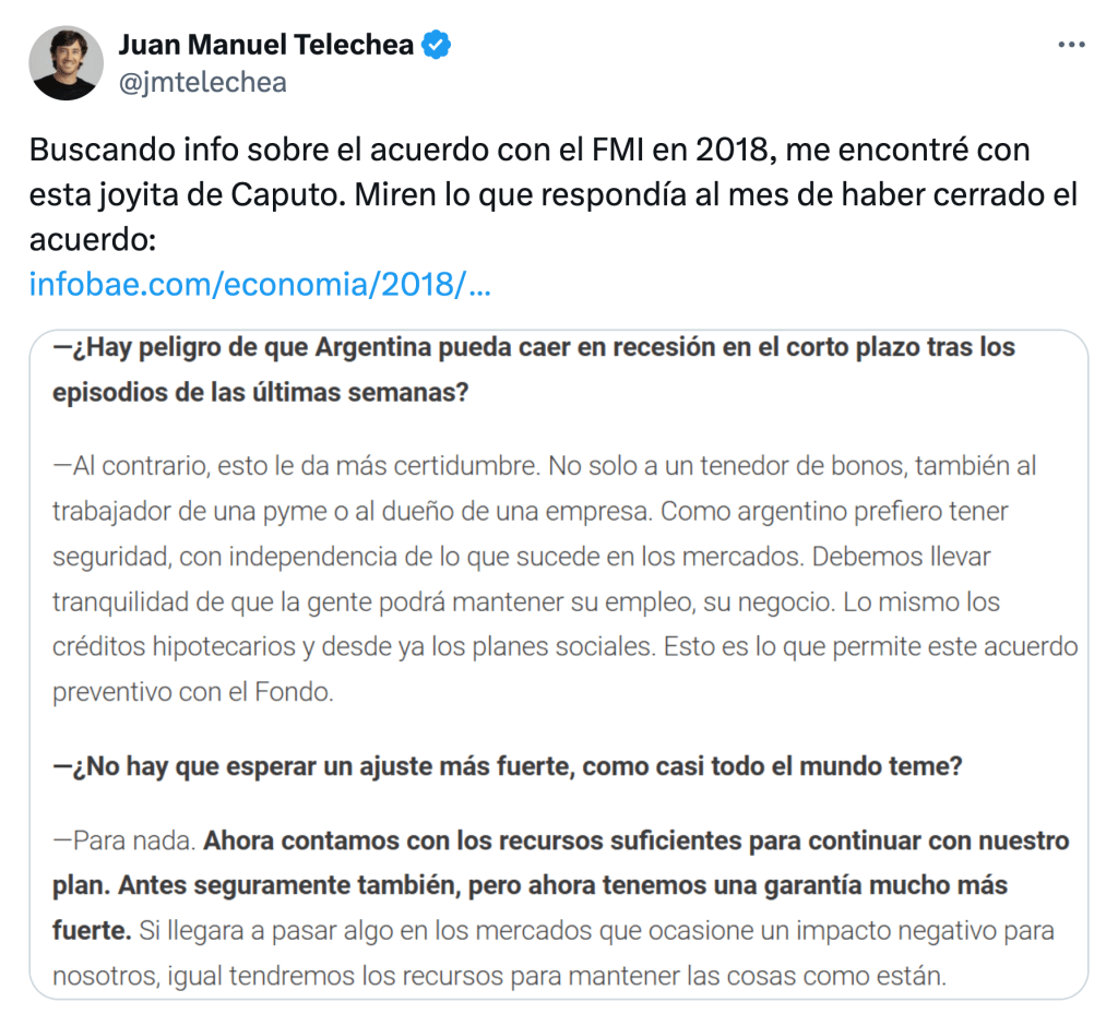 La «necesidad y urgencia» planteada por el DNU contrasta con la narrativa que presenta el plan de estabilización de Caputo como «el más exitoso de la historia». Asimismo, a los empeñosos redactores del decreto se les escapó que trataron de justificar la violación de la ley 27.612, conocida como «ley Martín Guzmán«, hablando de una «operación de crédito», que es exactamente dicha norma demanda que pase con el Congreso. Puede fallar.