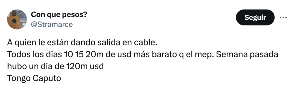 El viernes, de hecho, se registró una rueda particularmente intensa y de volumen negociado inusual, que terminó con una pérdida de reservas de 474 millones de dólares, la segunda mayor de la era Milei. Hubo gente que desarmó posiciones aceleradamente.