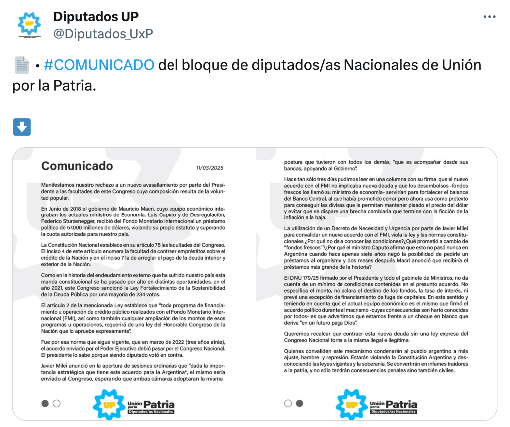 Unión por la Patria (UP) advirtió en un comunicado que el bypass al Poder Legislativo convertiría esa deuda en «ilegal e ilegítima».