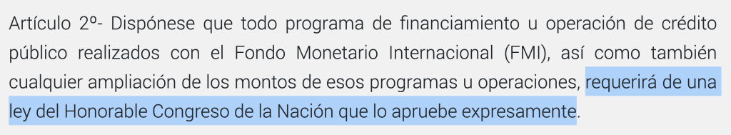 El artículo dos de la llamada «ley Guzmán» obliga a que cualquier acuerdo con el FMI sea autorizado por una ley del Congreso.