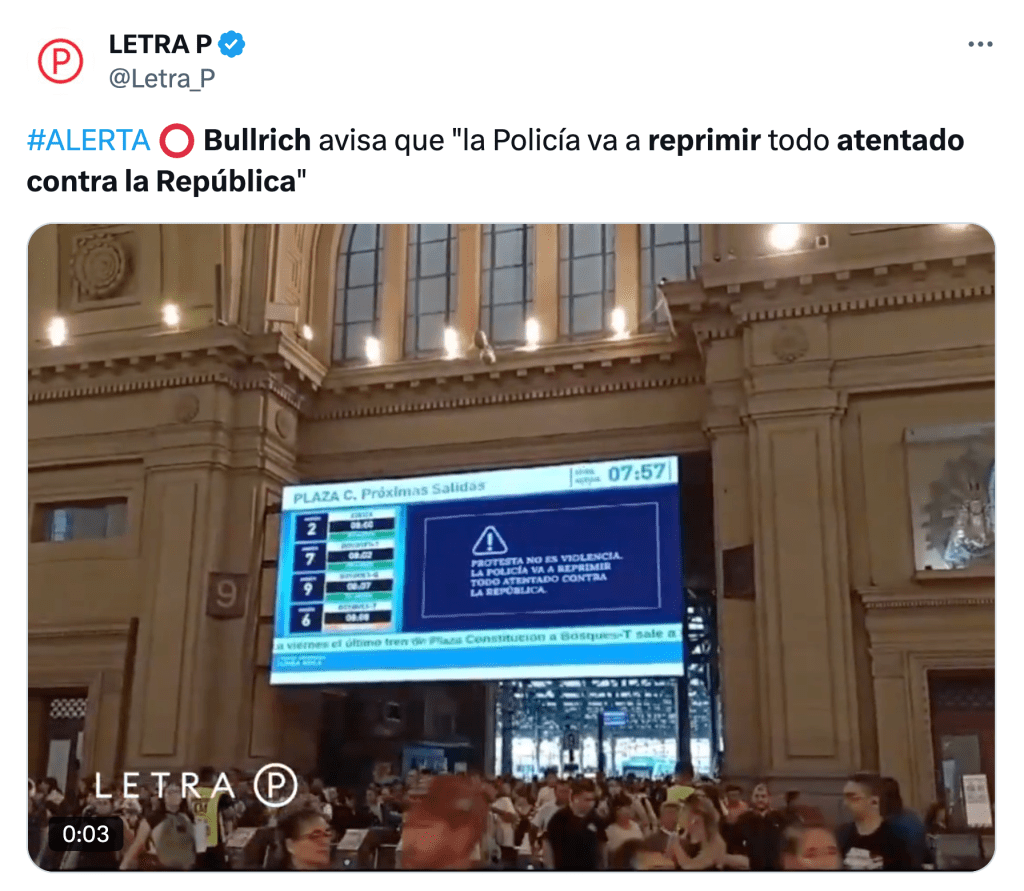 Requisas en combis de trabajadores que viajaban del conurbano bonaerense a la capital. Revisión de mochilas por portación de cara en nodos de transporte clave. Rehabilitación del 0800-BUCHON para denuncias anónimas. Avisos de «represión» –dicho así: murió la metáfora– en pantallas y por altavoces orwellianos en estaciones de trenes y en terminales como Constitución, Retiro u Once.