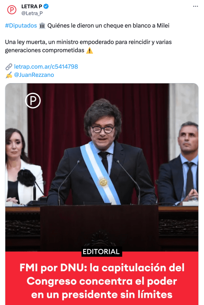 El pacto, una sentencia que pesará por generaciones y cuyo monto y condiciones ni siquiera se conocen, quedó supuestamente blindado por una mayoría oficialista ajustadísima que rompió toda noción de división republicana de poderes al votar un decreto de necesidad y urgencia (DNU) de ilegalidad flagrante. No es este el tema de esta crónica; Letra P publicó un editorial elocuente al respecto, firmado por Juan Rezzano, nuestro jefe de Redacción.