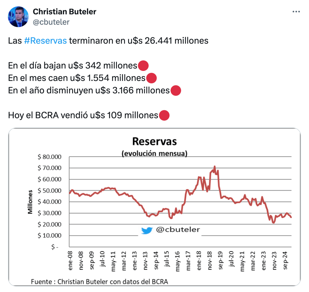 De hecho, la rueda de este lunes extendió la saga de quema de reservas–109 millones de dólares–, al filo de la prudencia, para evitar una disparada de los tipos de cambio paralelos, sobre los que no cesa la presión del desarme de posiciones del carry trade armado una vez más por el especialista Caputo. El venteo, destinado a aplicar un precario techo de 1.300 pesos a cotizaciones en alza, ya cumple siete ruedas seguidas y acumula una pérdida de 1.313 millones de dólares.