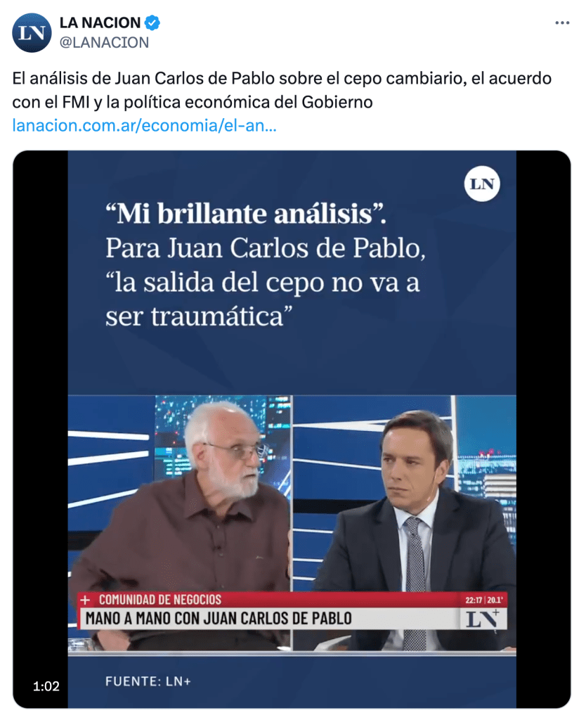 Mientras, el economista Juan Carlos de Pablo salió a dar entrevistas para llamar a la calma. Su figura interesa, más allá de su trayectoria, por su carácter de amigo, confidente y contertulio operístico del jefe de Estado, lo que busca sugerir que su palabra tranquilizadora es la de un vocero oficioso.