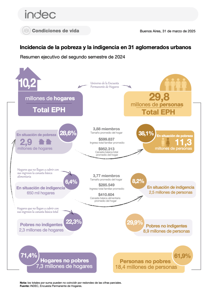 De acuerdo con el INDEC, la pobreza se redujo al 38,1% de la población en el segundo semestre, un universo equivalente a 17,9 millones de personas. En tanto, la indigencia bajó al 6,4%, alrededor de tres millones de compatriotas.