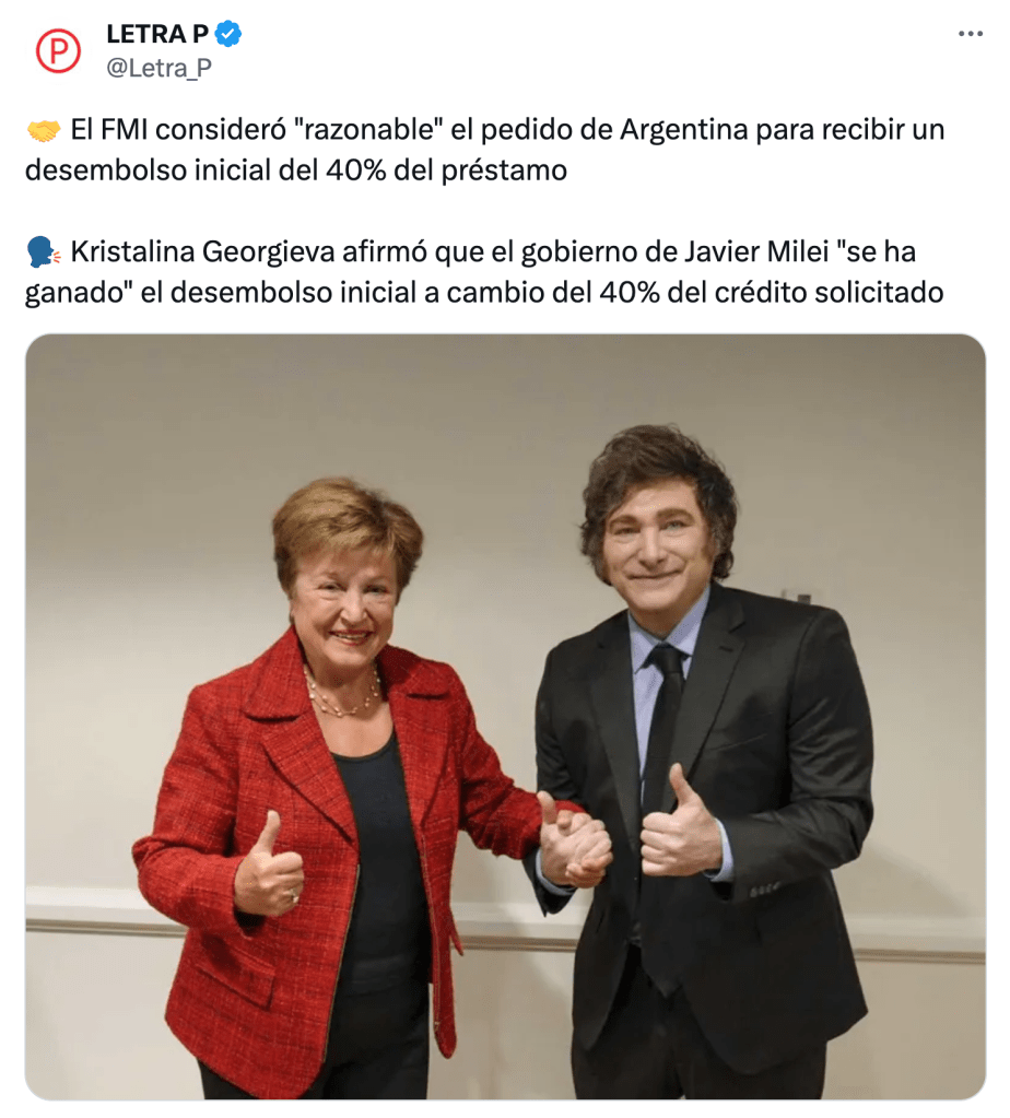 Kristalina Georgieva salió a decir algo más parecido a lo que Caputo venía rogando. Un desembolso del orden del 40% del programa de 20.000 millones de dólares en vías de aprobación, mayor que el habitual, «es una solicitud razonable. Se la han ganado, dado su desempeño», dijo a la agencia Reuters.