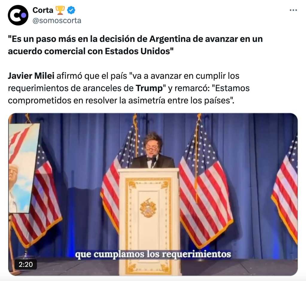 «Coincidimos con el presidente Trump. Es momento de hacer y estamos comprometidos en tomar las medidas necesarias para resolver la asimetría con los Estados Unidos en un plazo breve. Adicionalmente (…) vamos a avanzar (…) en la decisión de la República Argentina de avanzar con un acuerdo comercial con los Estados Unidos de América, donde los aranceles y las trabas al comercio sean tan solo un mal recuerdo del pasado».