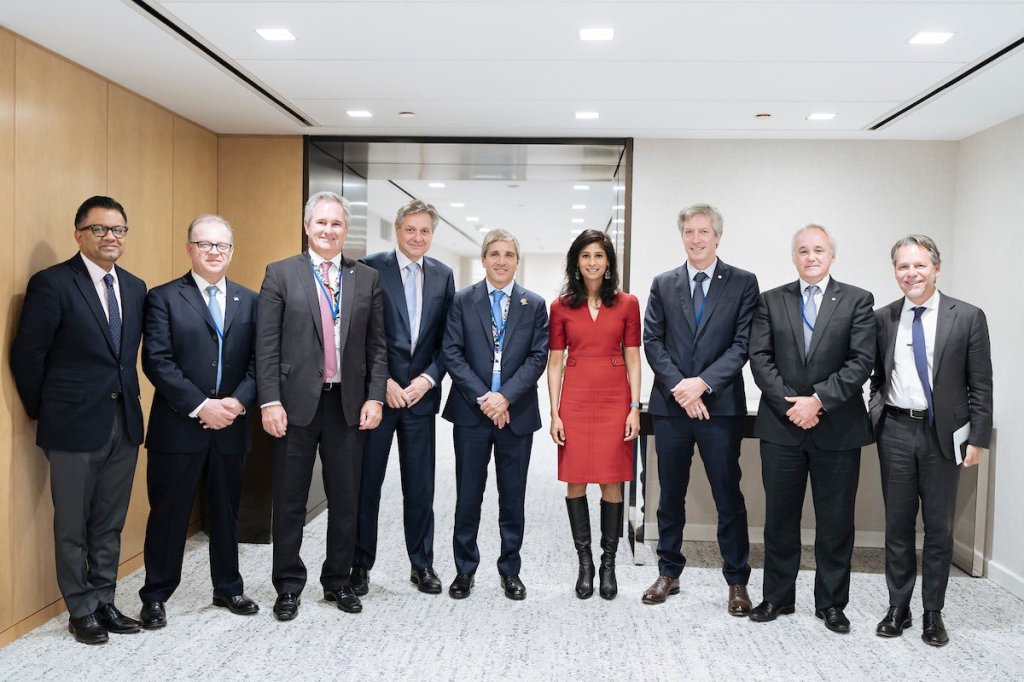 Toto Caputo y la número dos del FMI, Gita Gopinath, rodeados del equipo económico argentino. ¿Hasta qué punto bancará el organismo los desvíos prematuros al plan aprobado hace dos semanas
