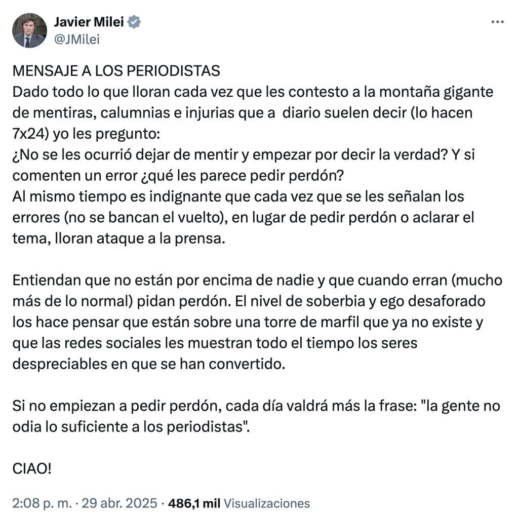 Milei asegura que los periodistas críticos hacen lo que hacen, entre otras depravaciones, porque están «ensobrados», lo que supone una práctica delictiva. El detalle es que, como presidente de la Nación, está obligado a denunciar esas violaciones a la ley en sede judicial, no en Comodoro Twitter.