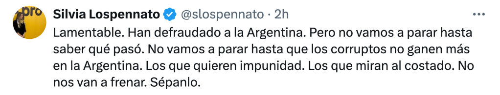 El Gobierno se declaró desolado por el desenlace, que atribuyó al reflejo de la casta en general y del kirchnerismo en particular de proteger a CFK. Así, desolado, se mostró el jefe del bloque de senadores de LLA, Ezequiel Atauche, tras la votación y así lo expresaron en innumerables posteos los principales referentes de la extrema derecha gobernante. Así lo hizo el mismísimo Presidente a las 22.10 del miércoles con un tuit escueto. «LAMENTABLE. Fin», escribió sobre el tablero de la votación.