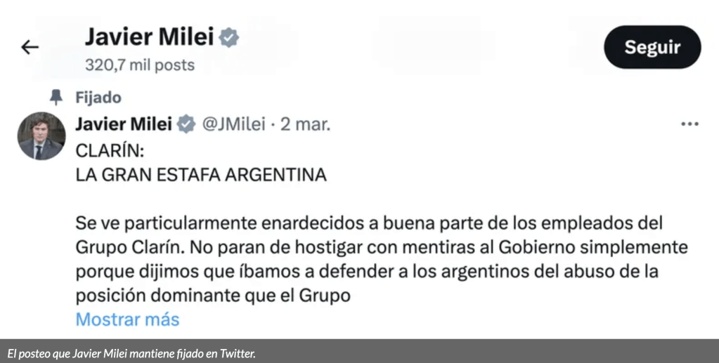 Milei mantiene como posteo fijado en Twitter un mensaje del 2 de marzo que postula que Clarín, «la gran estafa argentina»,«quiere quedarse con el 70% de las telecomunicaciones argentinas. Eso implica que tu celular, tu internet, tu teléfono, todo lo controlaría el mismo grupo económico, que por su posición dominante podría cobrarte cualquier precio porque no habría competencia. No vamos a dejar que eso suceda», promete.
