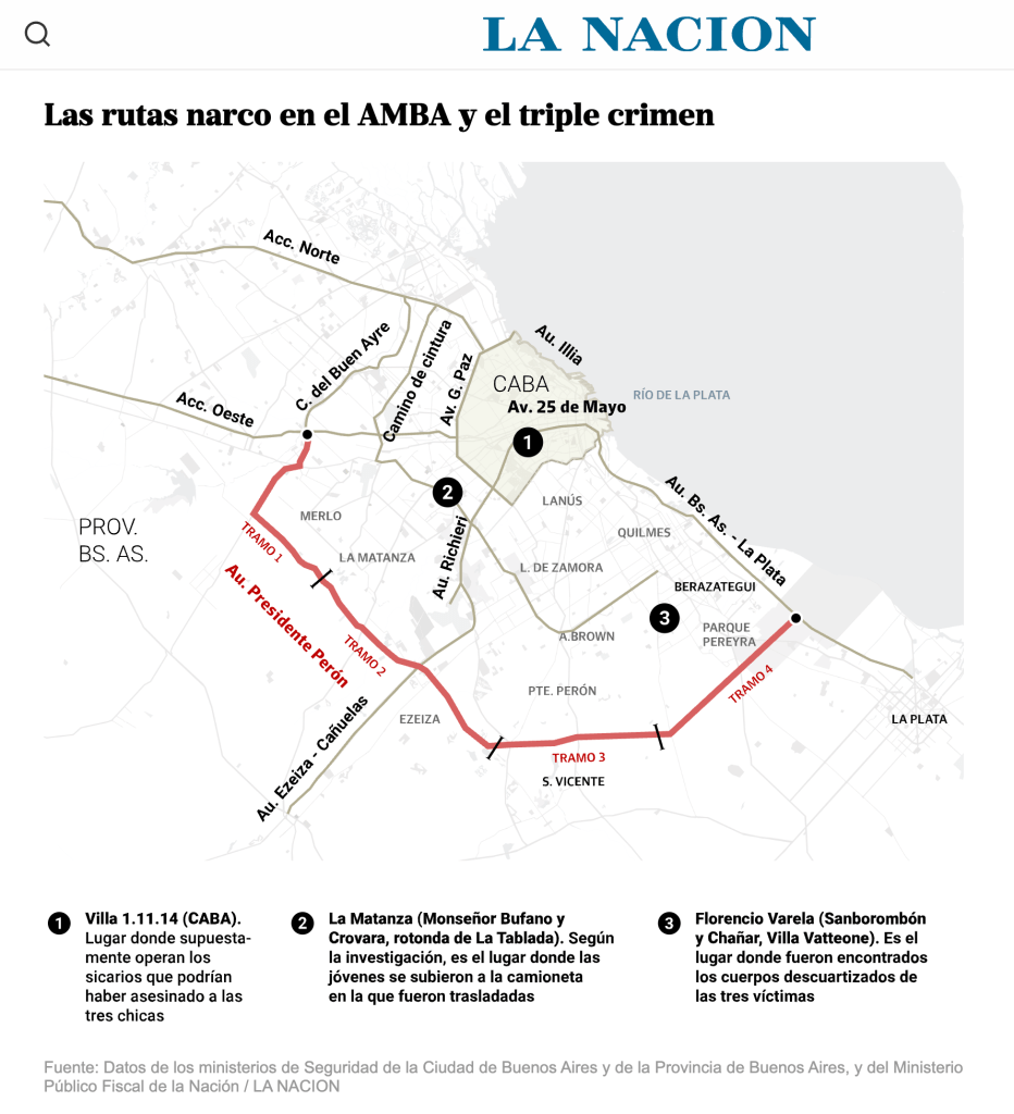 «Los narcos operaban desde una villa porteña, levantaron a las tres mujeres en La Tablada y las masacraron en Florencio Varela. Otro dealer vivía en Barracas y lo asesinaron en Merlo. Otra banda ocultaba la cocaína en una fosa de General Rodríguez, la llevaba a un departamento cerca del Obelisco y generaba desde ahí un estropicio en todo el Conurbano. Y los ejemplos se amontonan, contradiciendo a los políticos que durante días descargaron las responsabilidades por delitos y cadáveres al lado opuesto de la General Paz».