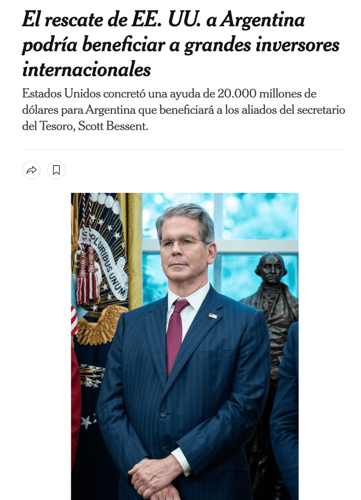 Hay, sin embargo, otra línea de análisis, surgida en Estados Unidos y convertida en denuncia de los senadores de la oposición demócrata, de artículos en The New York Times y otros medios, y en advertencias de economistas como Paul Krugman. La misma –curiosamente fuerte por implicar a un país como la Argentina– indica que Bessent habilita la salida de especuladores amigos sin pérdidas –y con cargo a los contribuyentes estadounidenses y argentinos– de la bicicleta armada por Caputo, como señaló este sábado Esteban Rafele en Letra P.