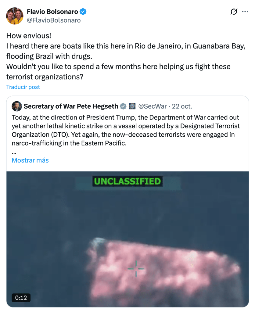 Días atrás, el senador federal por ese estado Flávio Bolsonaro, hijo del expresidente Jair Bolsonaro, había pedido en un posteo que el Pentágono replicara en la bahía de Guanabara los ataques que lleva a cabo en el Caribe contra lanchas presuntamente ligadas al tráfico de drogas.