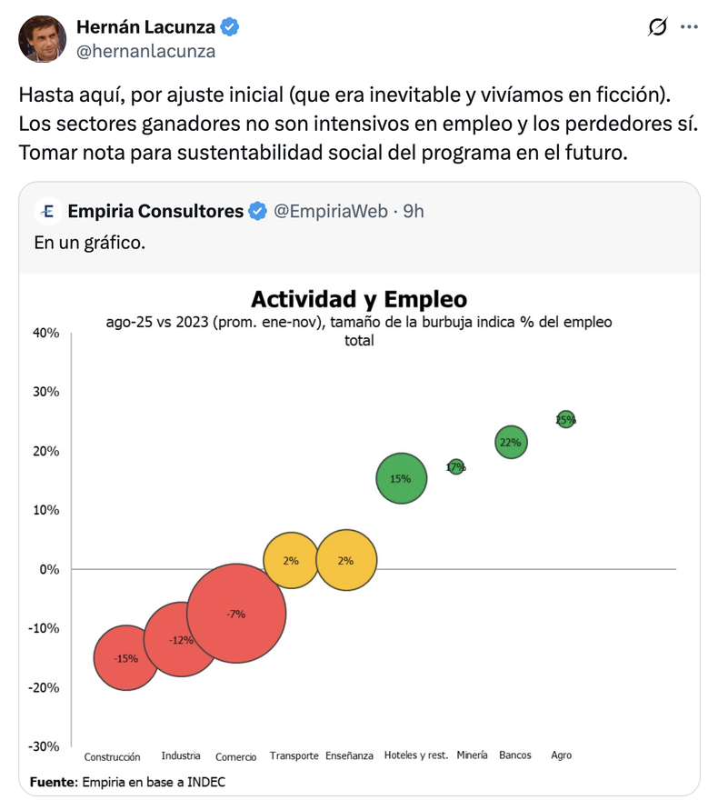 No necesariamente. Por un lado, los títulos de la deuda sostienen sus ganancias recientes por algo muy diferente de los méritos del equipo –económico–. Es porque se produjo «un gol de otro partido»: la aparición del Tesoro de los Estados Unidos como garante de los pagos de deuda… mientras Milei gobierne, haga los deberes y las posibilidades de reelección en 2027 parezcan grandes. No se trata, precisamente, de un statu quo demasiado estable.