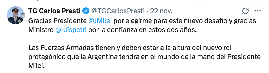 Entre otros posteos desafortunados, Presti agradeció el nombramiento abogando por que las Fuerzas Armadas estén «a la altura del nuevo rol protagónico que la Argentina tendrá en el mundo de la mano del presidente Milei».