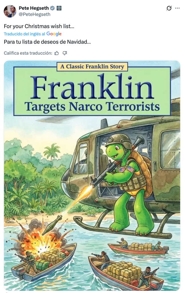 El clamor sobre un evidente crimen de guerra resultó atizado por un irritante posteo del ministro, que mostró a la tortuga Franklin disparando a botes desde un helicóptero con «espíritu navideño».