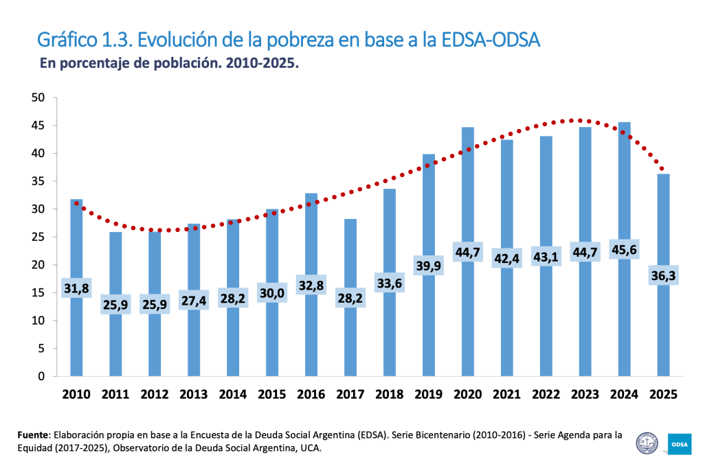 «Si bien puede identificarse un proceso de estabilización posterior al ajuste, es necesario matizar las mejoras registradas en 2024-2025. Su sostenibilidad en el tiempo y su capacidad para generar cambios persistentes al interior de la estructura social aún deben ser evaluadas. En este sentido, persisten dudas respecto de si estas mejoras representan una recuperación duradera o solo un alivio transitorio«, señala el trabajo del equipo dirigido por Agustín Salvia.