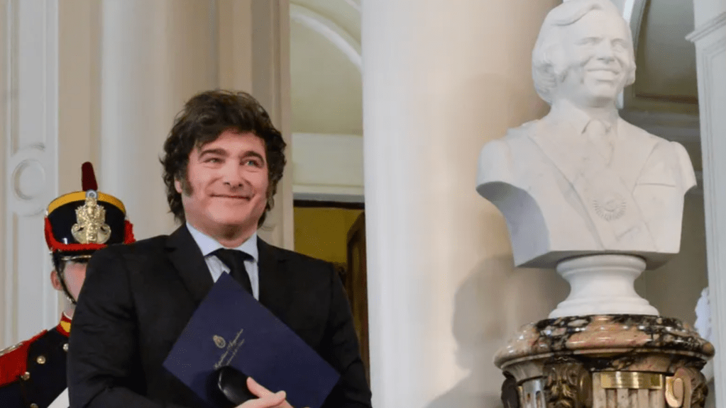 Javier Milei junto al busto de Carlos Menem que mandó colocar en la Casa Rosada.