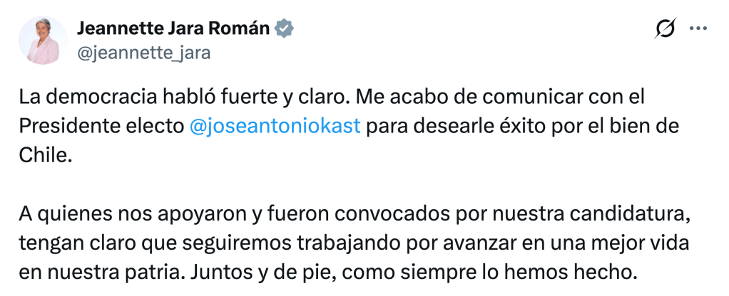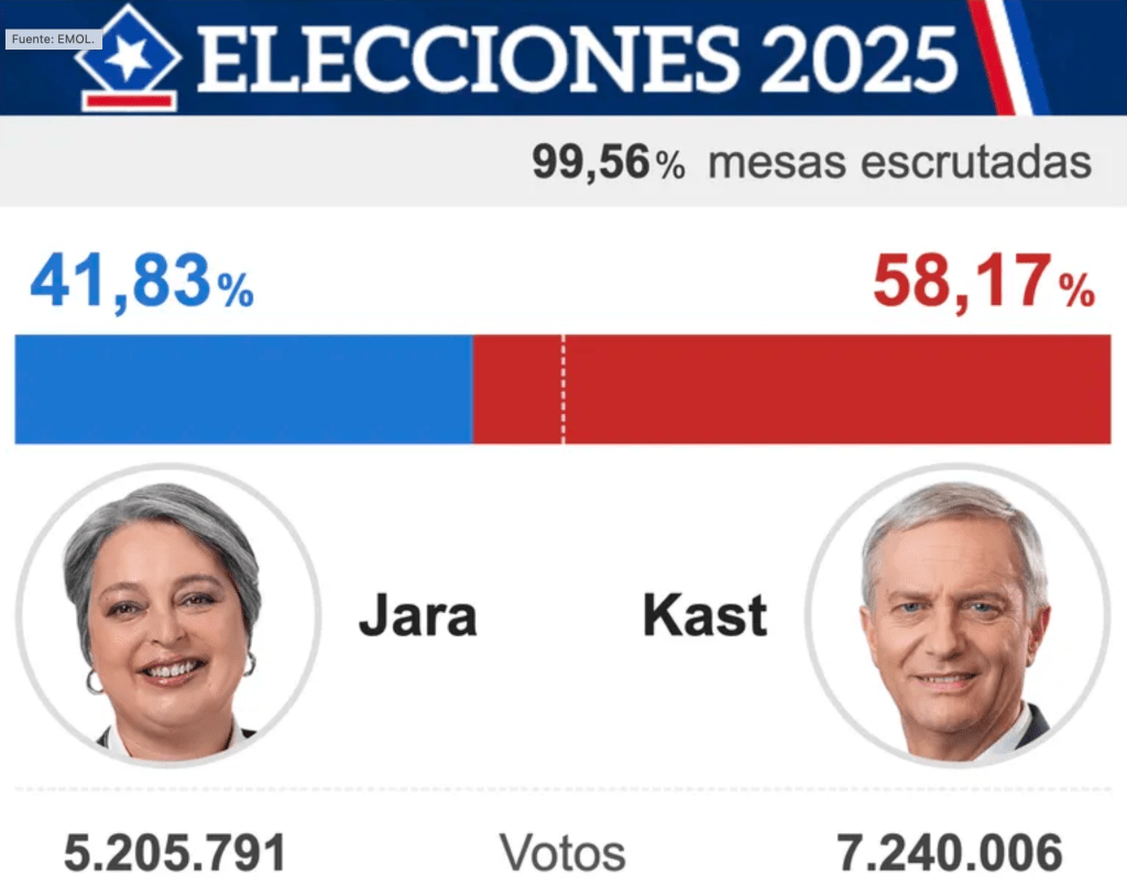 José Antonio Kast se convirtió este domingo en presidente electo de Chile tras aplastar a la izquierda: el ultraderechista candidato del Partido Republicano venció a la comunista Jeannette Jara, exministra del Trabajo y Previsión Social del mandataio saliente, Gabriel Boric, por más de 58% a casi 42%.