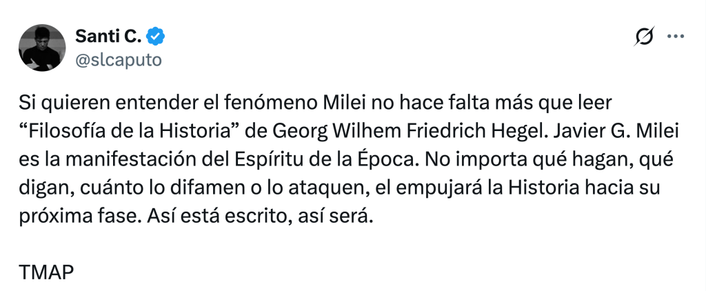 Hace un tiempo, en la cuenta de Twitter que ahora se atreve a reivindicar, Santiago Caputo escribió que Milei encarna ese Zeitgeist en la Argentina de hoy, hagan lo que hagan adversarios destinados al fracaso.