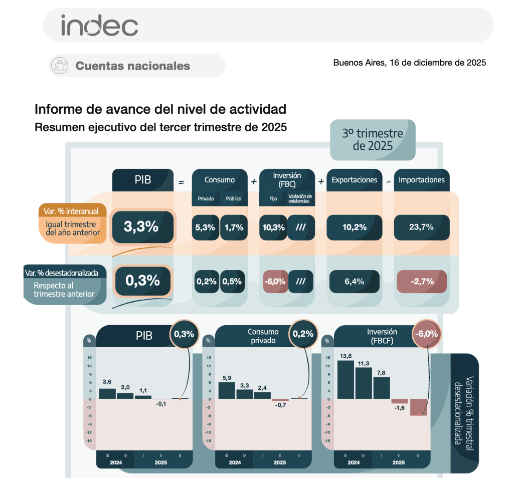 El INDEC dio cuenta este martes de un crecimiento del 5,2% en lo que va del año, pero con un tercer trimestre que mostró un freno en seco de la actividad, con un aumento marginal de apenas 0,3% que evitó, por un pelo, un segundo ciclo de retracción y, con eso, la caída en recesión técnica.