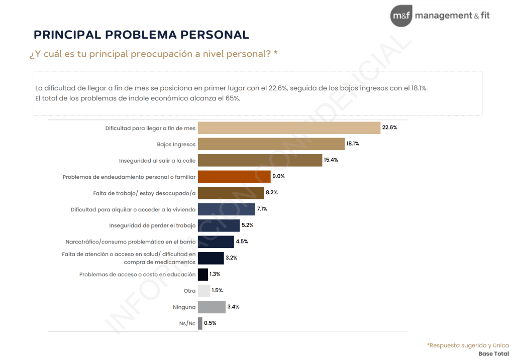 Por otro lado, las problemáticas vinculadas a la insuficiencia de los ingresos, el endeudamiento de las familias y la precariedad del trabajo se llevan seis de las diez menciones sobre las «principales preocupaciones a nivel personal».