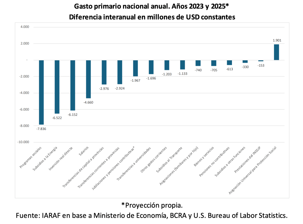 Como antes de la Gran Crisis, el ajuste es una constante. Según un informe del Instituto Argentino de Análisis Fiscal (IARAF), «respecto de 2023, el gasto primario consolidado de 2025 tendría un descenso de 6,5 puntos porcentuales del PBI, dadas bajas de 5,1 puntos del PBI del gasto nacional, de 1,1 punto del PBI del provincial y de 0,3 punto del PBI del municipal».
