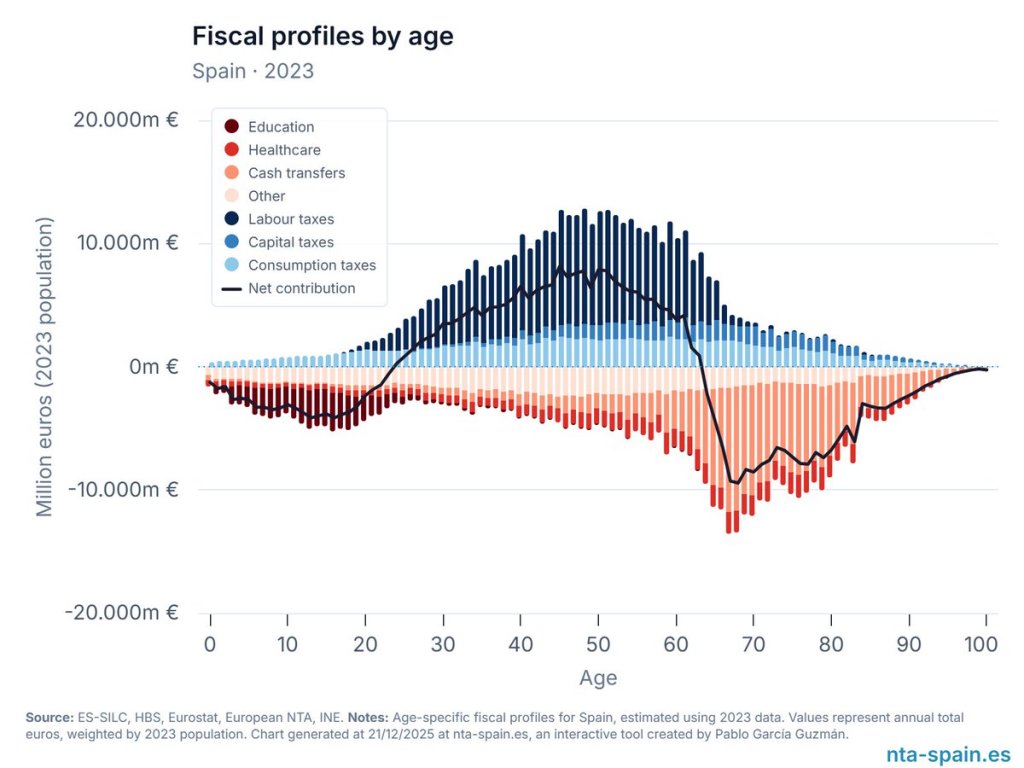 Pablo García Guzmán, economista del Banco Europeo de Reconstrucción y Desarrollo (EBRD), convirtió la estadística en arte con un gráfico que resume la relación entre edad y contribución fiscal neta (impuestos pagados vis-à-vis beneficios públicos recibidos en forma de servicios de educación, salud y jubilaciones) con datos oficiales de 2023 correspondientes a España.